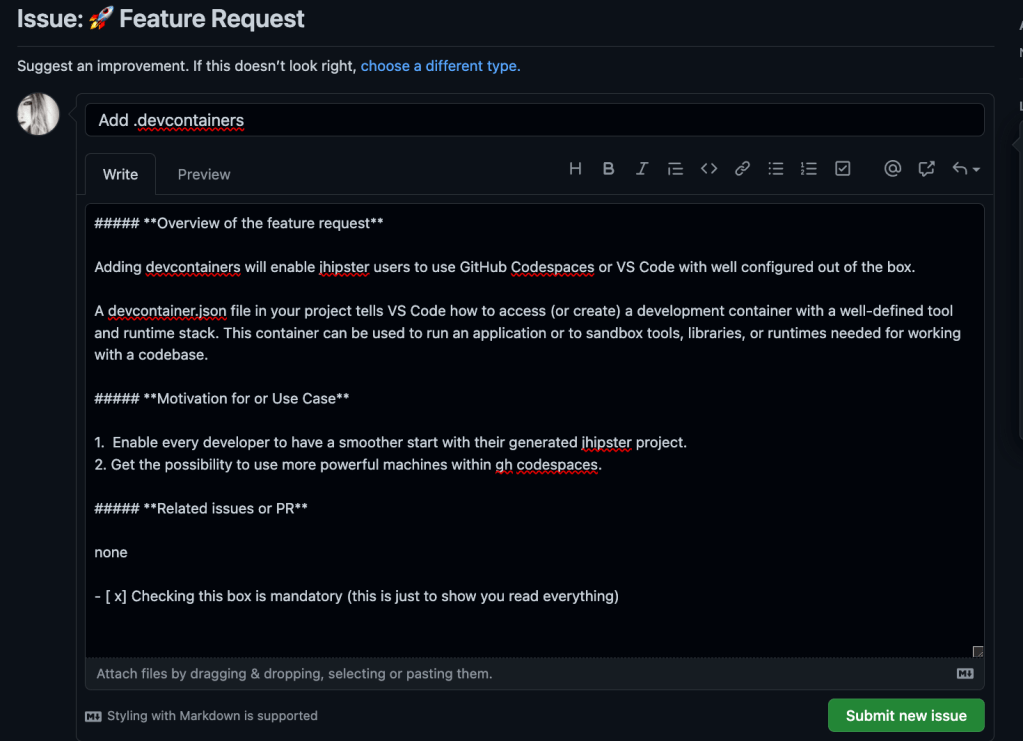 Alternatively, I could have used the sub-generator functionality of jHipster and let the .devcontainer configuration files only be generated, when a command like jhipster devcontainer is called. For that, you create a new folder with a meaningful name. So I would have created a folder .devcontainer with the following file structure.