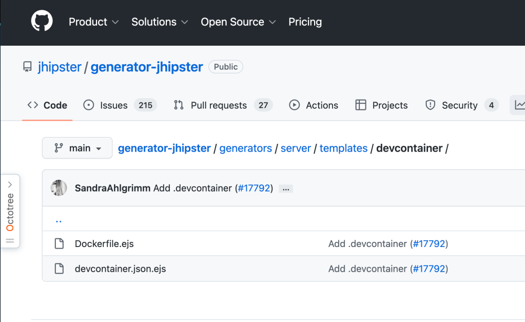 I want two files to be generated for devcontainers. As they’re going to end up in a hidden .devcontainer folder and will be valuable to most jhipster devs, decided that they should get generated for all new jHipster server projects. So I put the devcontainer.json.ejs andDockerfile.ejs into a new created devcontainer folder under server/templates.